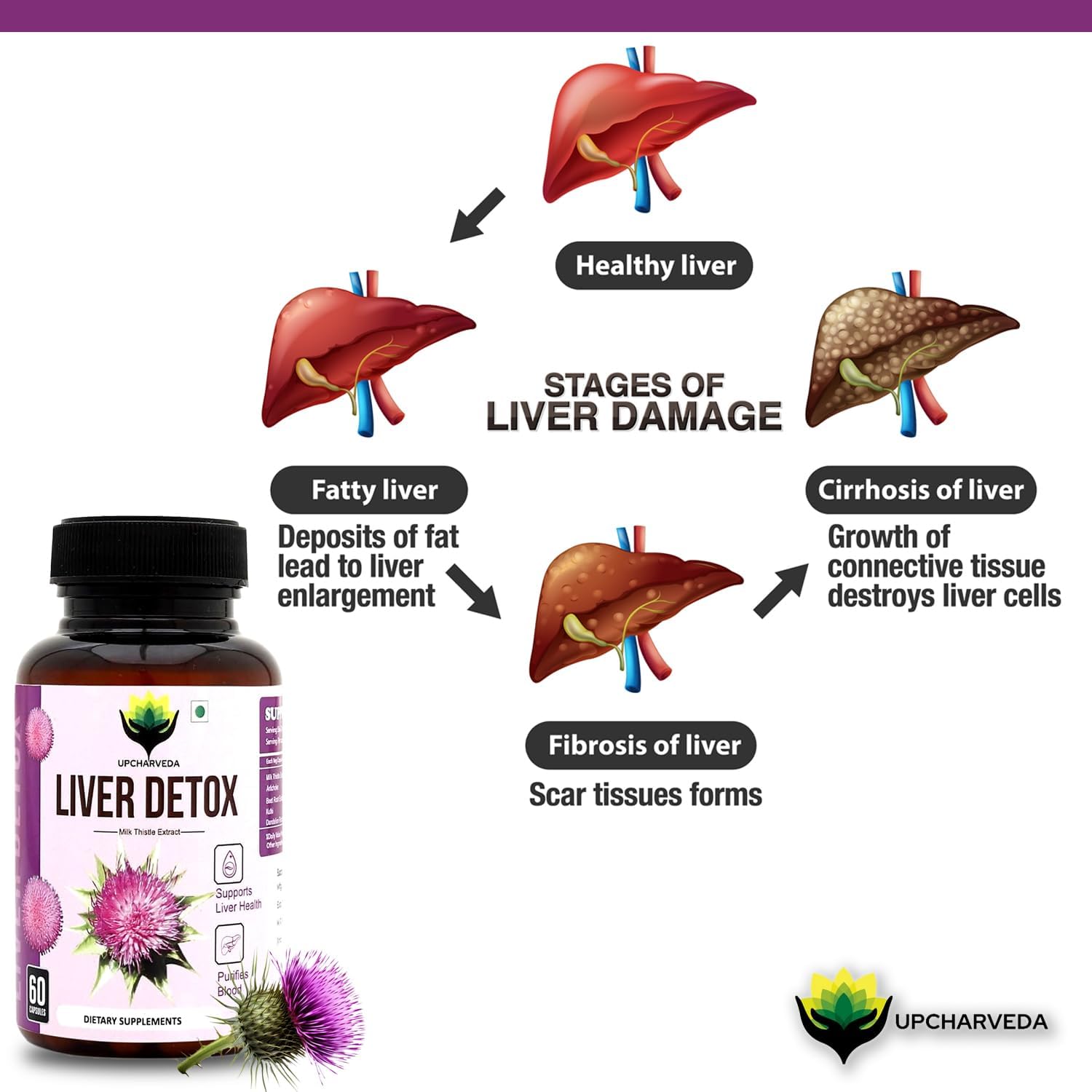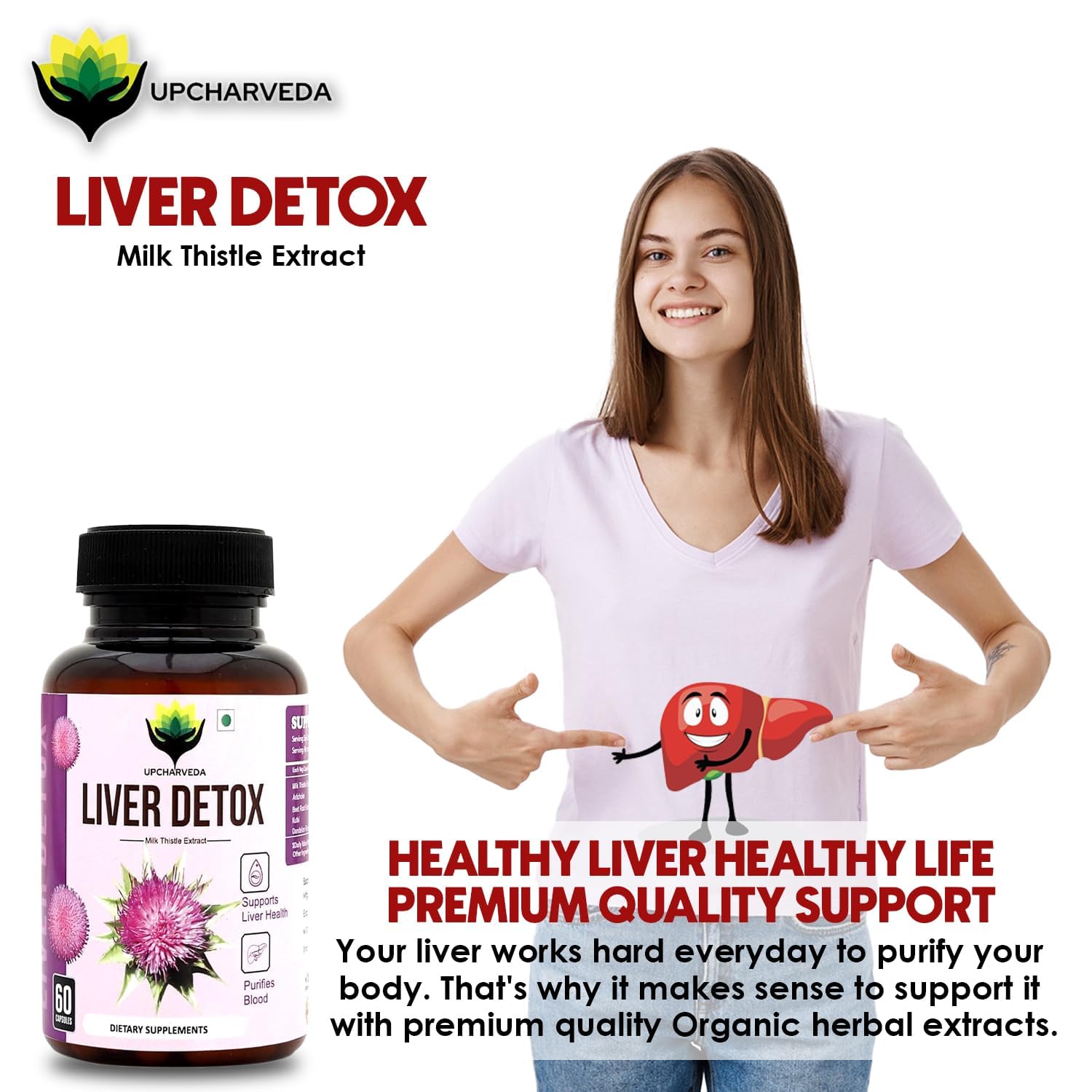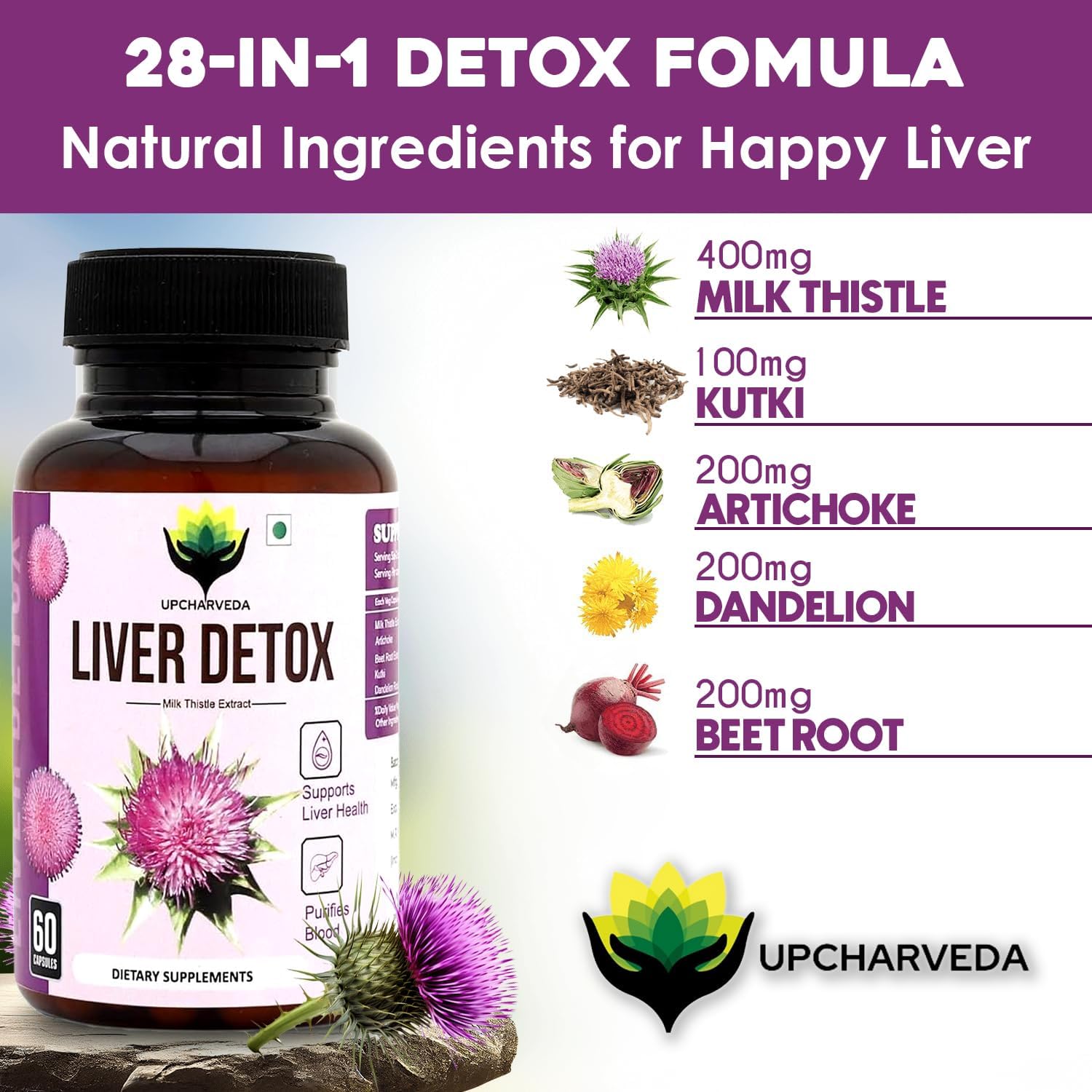 Upcharveda Liver Detox with Milk Thistle helps cleanse and protect the liver, remove toxins, rejuvenate liver cells, support digestion, and boost vitality with a vegan Ayurvedic formula. daily use now